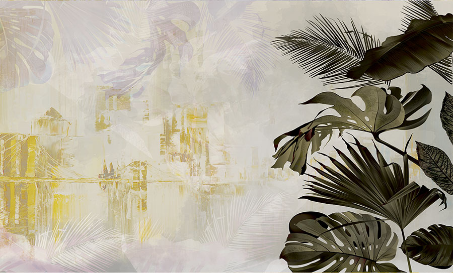 Home Wallpaper Tropical and Animal Leaves Faded Purple and Yellow