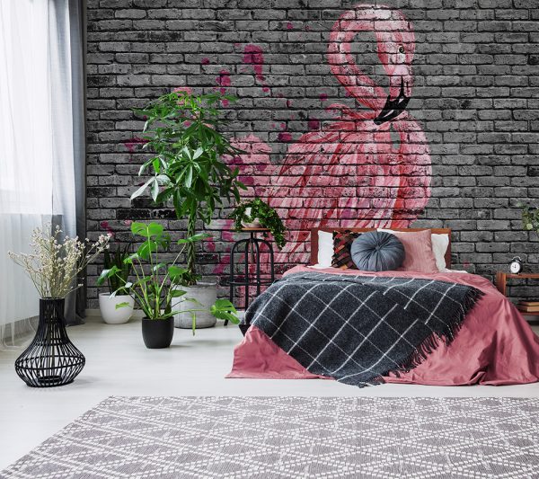 Home Wallpaper Material Bricks Flamingo on Grey Bricks